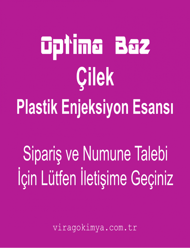 Optima Baz Plastik Enjeksiyon Çilek Esansı, çilek kokusunu net olarak verebilen, özel üretim plastik enjeksiyon esansıdır. 180 – 300 derece aralığında ısıyla işlenebilir. Nihai üründeki koku; kalıcıdır, etkilidir, dengeli yayılıma sahiptir ve ortam koşullarından minimum seviyede etkilenir. Yüksek saflık değerinde TOP KALİTEDİR.
